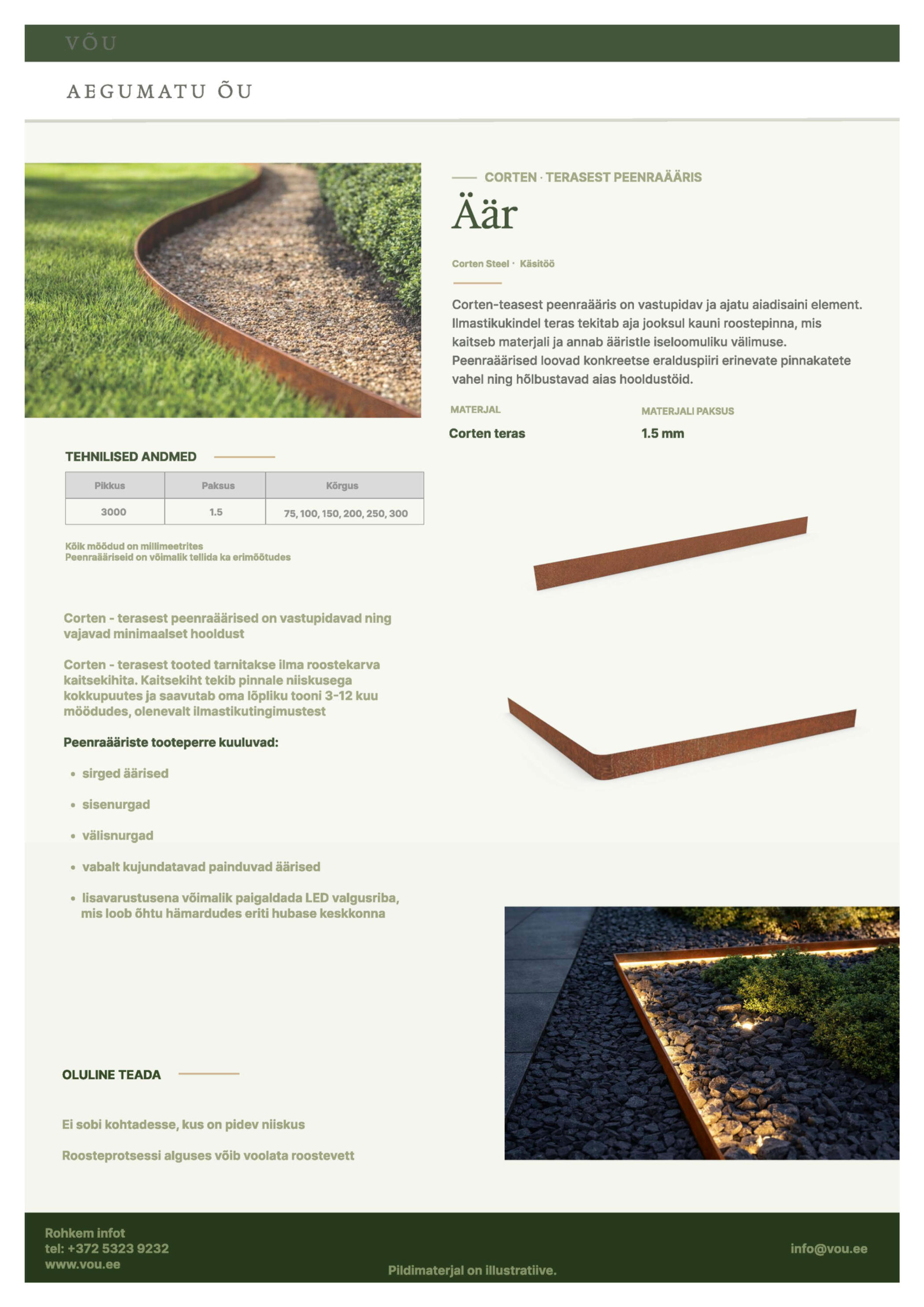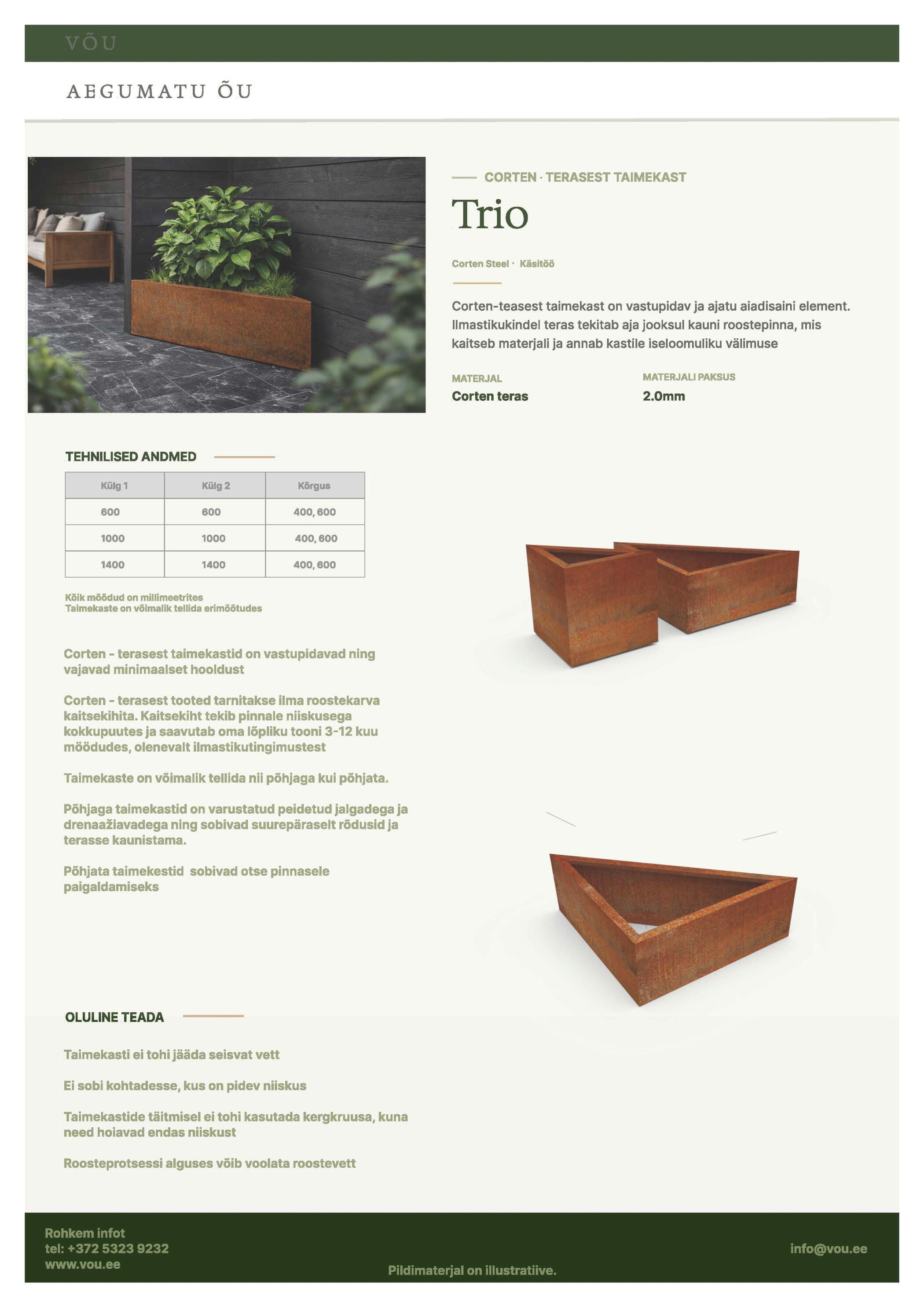 VÕU sai alguse ühest lihtsast mõttest - ÕU ei ole lihtsalt maja ümbrus. See on koht, kus hommikul juuakse esimene kohv, kus lapsed jooksevad paljajalu ja kus suveõhtud venivad pikaks.Meie nimi kannab kahte lugu. See tuleb Võidu tänavast - meie enda alguspunktist. Ja samas peitub selles sõnas ka võit julgus teha midagi omamoodi, päriselt ja kestvalt.Me loome modernseid ja kestvaid corten-terasest tooteid, mis muutuvad ajaga ainult kaunimaks. Corten ei peida ennast - ta elab ja muutub ajas, omandab sügavust ja iseloomu. Just nagu hästi loodud aed, mis ei sünni üheks hooajaks, vaid kasvab ja küpseb aastatega.Meile meeldib selge vorm, puhas joon ja põhjamaine rahu. Iga peenraääris, lillepott või puuderiiul on detail, mis ei karju tähelepanu järele, kuid loob terviku. Vaikne luksus, mis tunneb end kindlalt nii modernses linnahoovis kui looduslähedases maakodus.Me ei tee lihtsalt tooteid. Me aitame kujundada koha, kuhu on hea tulla ja kuhu on veel parem jääda.