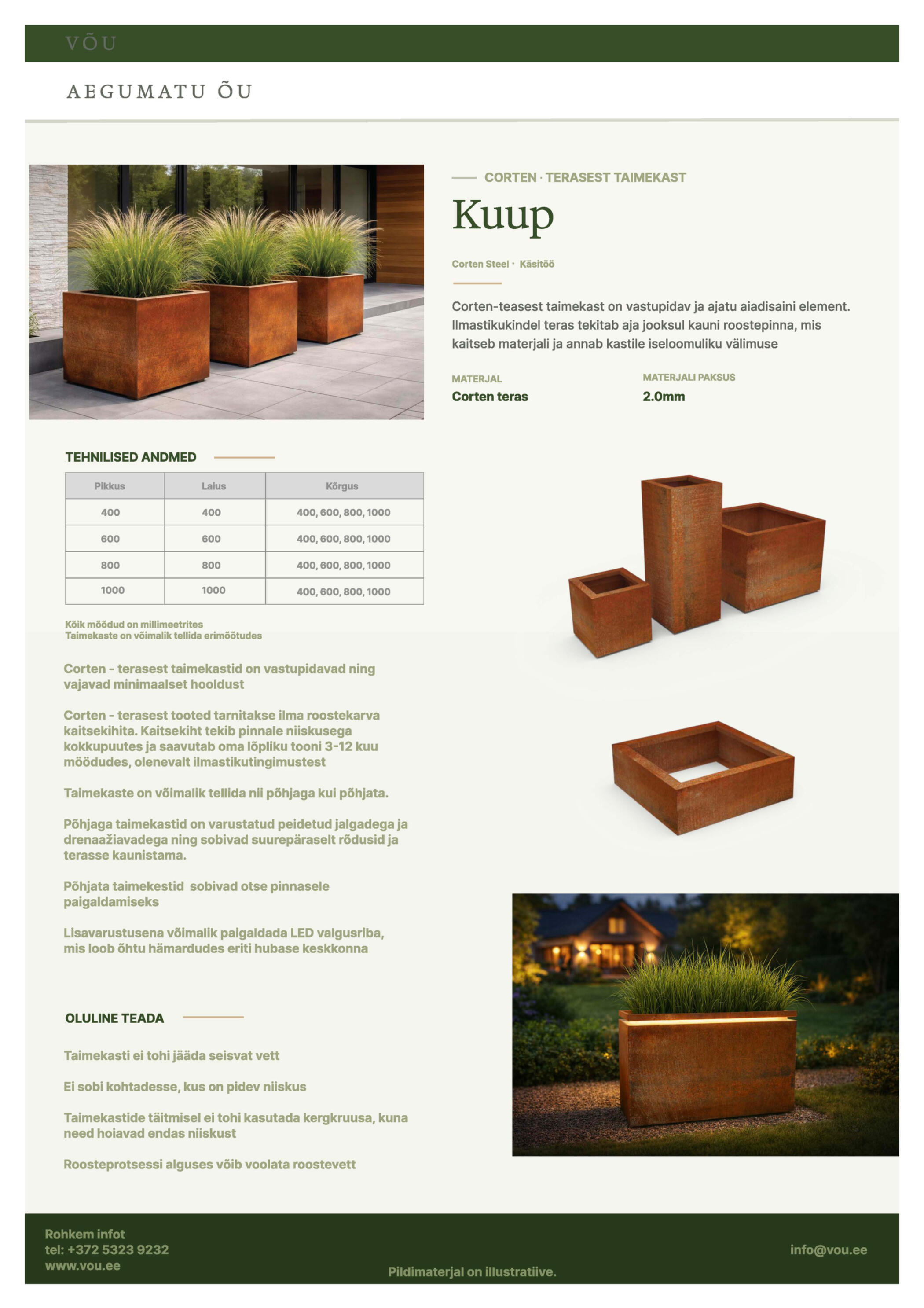 VÕU loob arhitektuurseid corten-terasest välielemente disainiteadlikule kliendile Eestis ja Skandinaavias. Tooted, mis muutuvad ajas väärikamaks.